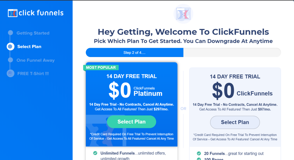ClickFunnels standard plan will cost you $97 per month, and their platinum plan will cost you $297 per month. You could use their 14 days’ trial to see which plan suits you better.