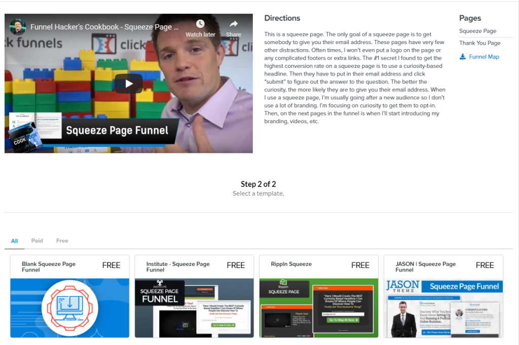 Let’s select the Squeeze Page Funnel, a strategy that you can use to generate leads for your business. Scroll down to see all their pre-built templates that are available to you.