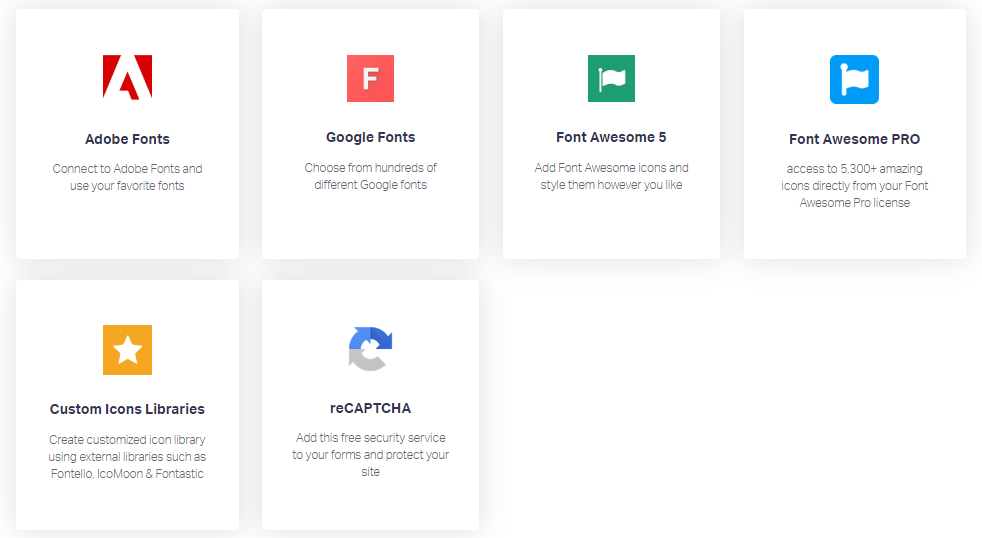 Other services like Adobe Fonts, Google Fonts, Font Awesome 5, Font Awesome PRO, Custom Icons Libraries, and Recaptcha could be connected with Elementor with ease.