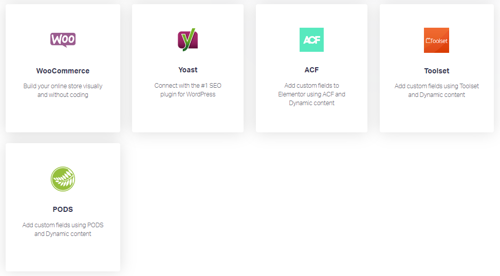 You can even integrate some of the best plugins in WordPress with Elementor. WooCommerce, Yoast, ACF, RankMath, Toolset, PODS, and many more.