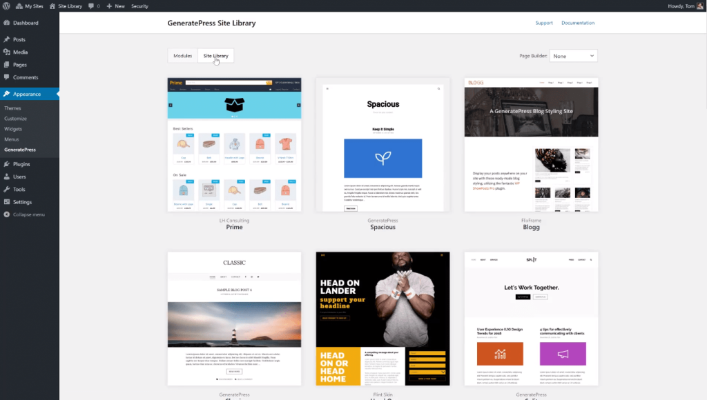GeneratePress’s premium version gives you a Site Library that provides various importable demo sites to kick start your project.