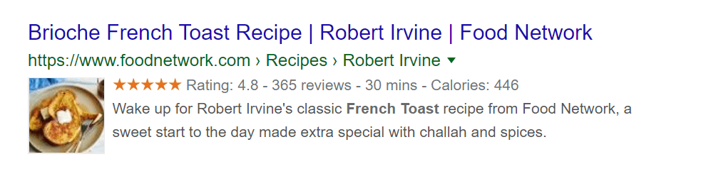 Rich snippets, also known as Rich Results, are typical Google search results with additional data displayed in it. The search engine retrieves this extra information from Structured Data, which is found in your HTML code.