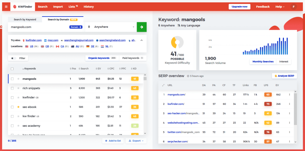 Created by Mangools, KWFinder boasts a modern design with a strong focus on simplicity. The tool keeps user experience at the heart of both functionality and design.