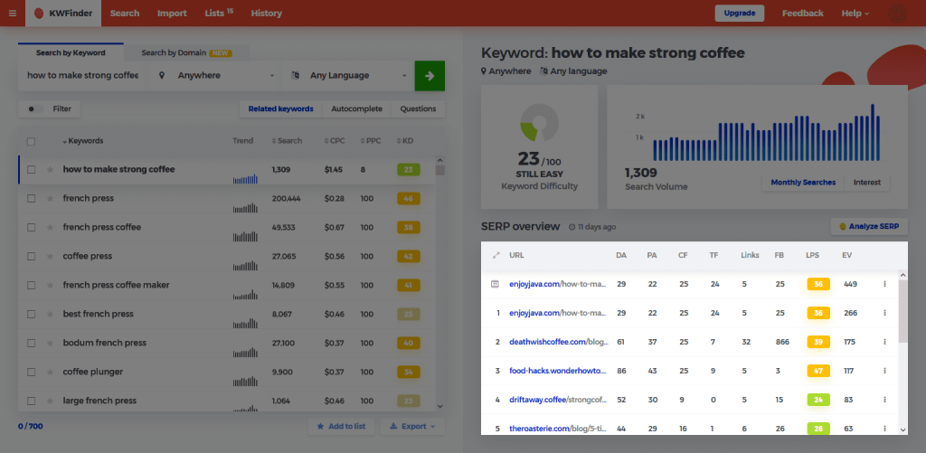 However, the good thing about KWFinder is that the difficulty scores are surprisingly reliable. You could optimize your site by solely using the keywords that have a low difficulty score (between 1 to 30).