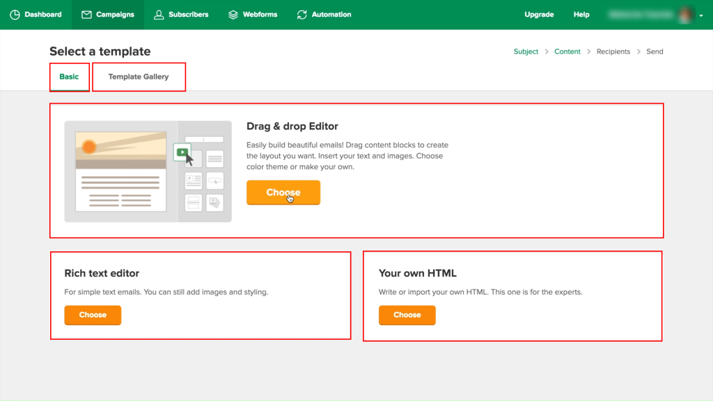 In addition to offering different types of campaigns, Mailerlite gives you access to a range of templates and editors that make email marketing a lot faster and more convenient.