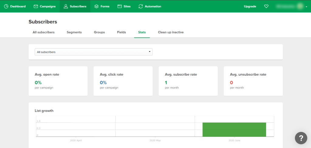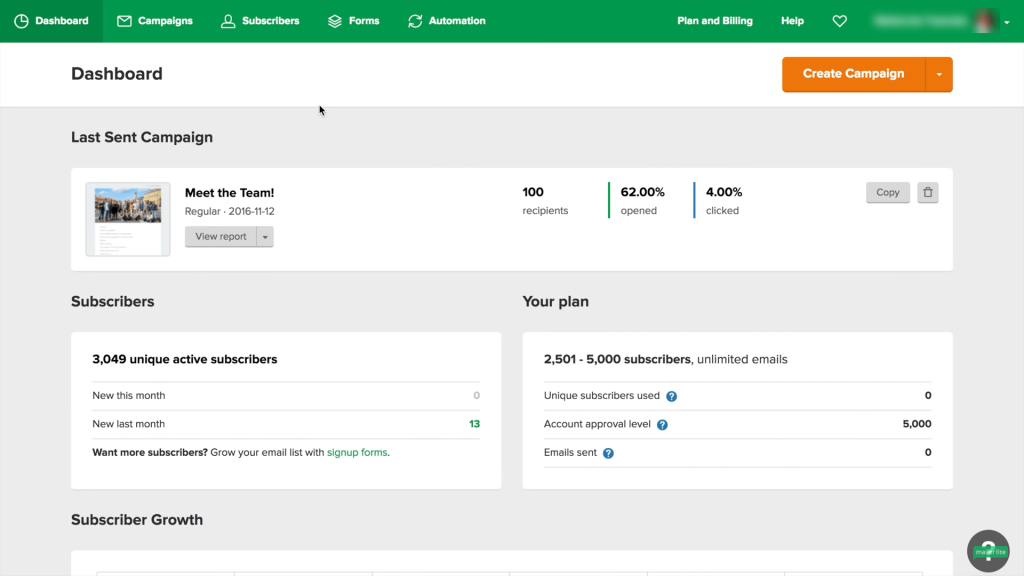 The Dashboard gives you a quick overview of your campaigns, subscribers, and plan. The page also has subscriber growth stats, automation stats, and form stats, which enable you to track progress at a glance.