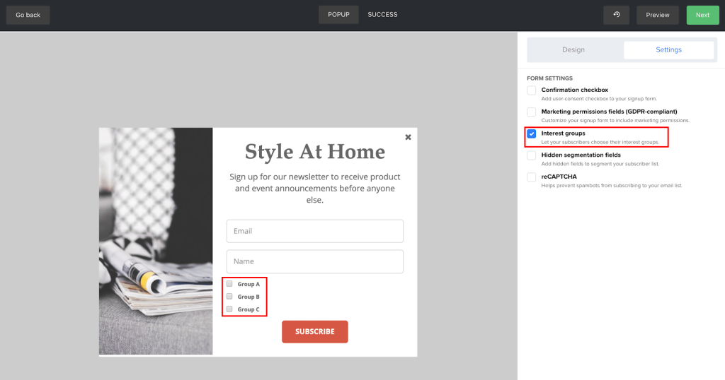 You can integrate checkboxes into your popup form and sort users into interest groups directly.