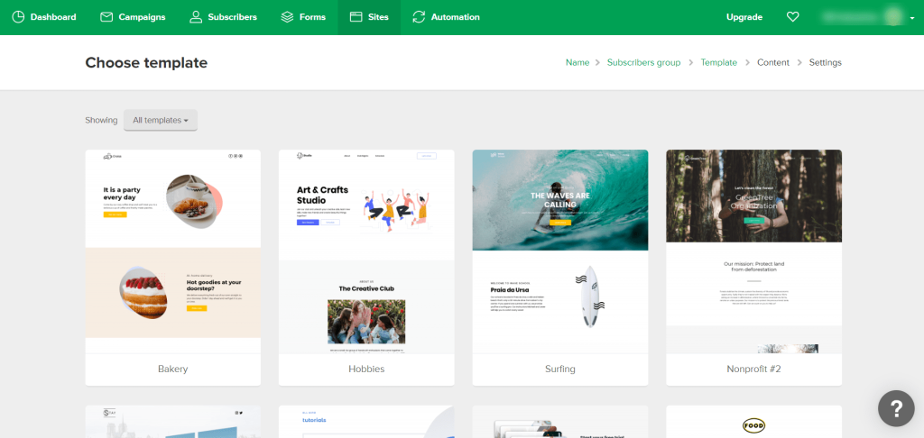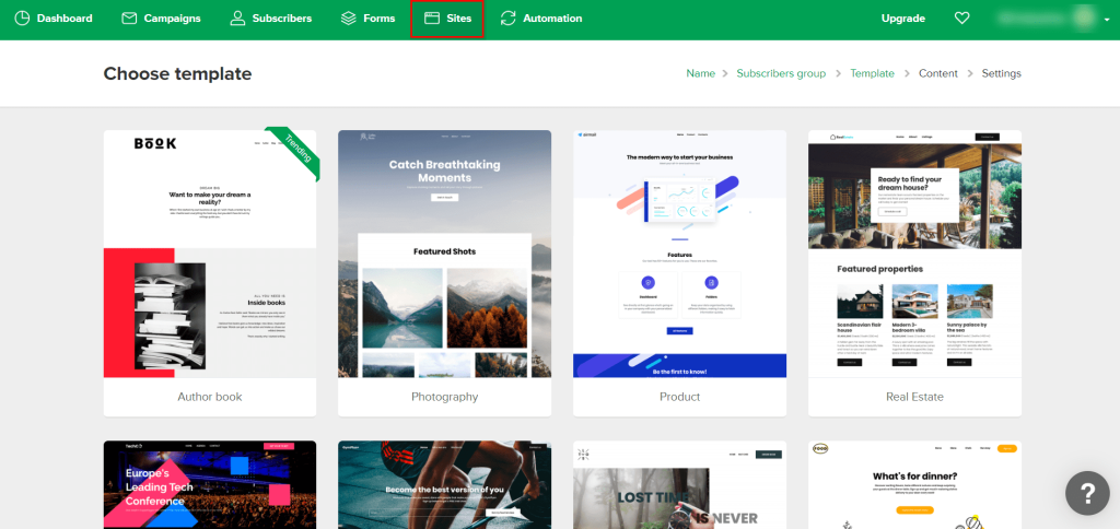 Creating landing pages is just as easy. You can create one from the Landing Pages tab in the Sites section. The process is also the same; you must name your landing page and select subscription groups before you can access the templates.