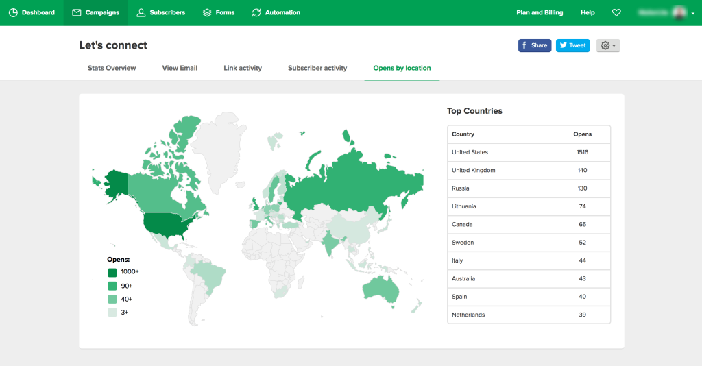 The Opens By Location feature is another nifty tracking feature that helps you see where your campaigns are most effective.