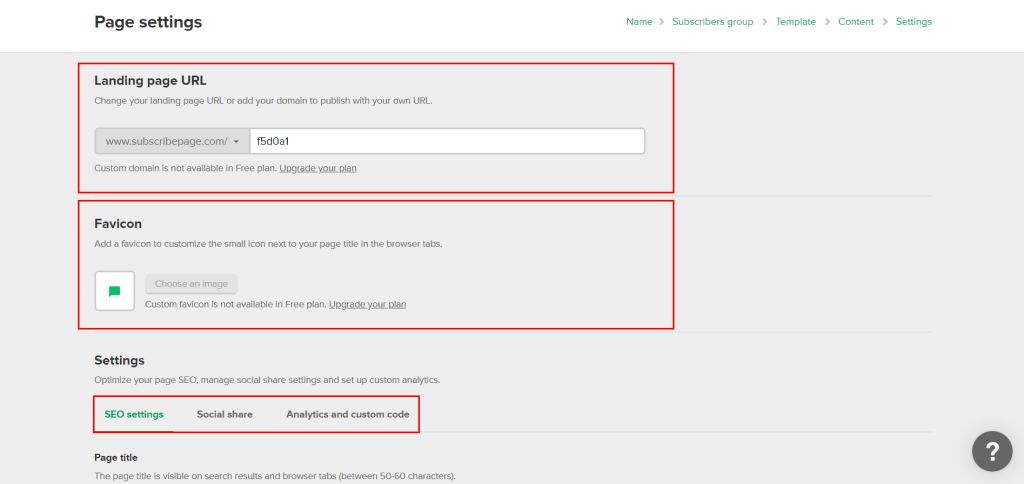 After you customize your website or landing page, you are redirected to a Page Settings page where you can set a custom URL for the page, add a favicon, and configure SEO, social sharing, and analytics settings.