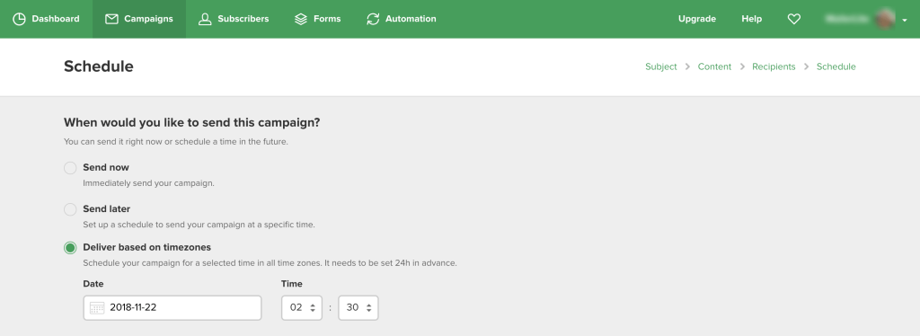 Additionally, regardless of which type of campaign you set up, you can deliver emails based on time zones using the options at the end of setup. The feature enables you to deliver emails according to your subscribers’ local time.