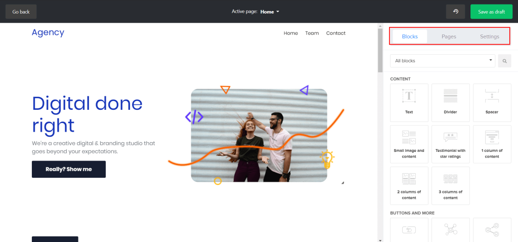 The landing page builder is similar to the website builder – you can add new blocks via the drag-and-drop interface and customize existing ones with ease.